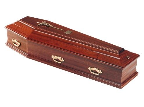 Our double-tiered "stair lid, provides a grand and multi-layered architectural profile. Crafted from premium solid hardwood with a mirror-like high-gloss finish, it is accented by hand-carved rope molding and elegant flared sides. This model combines a majestic silhouette with gold-toned swing-bar hardware and a luxury velvet interior for a truly dignified tribute.