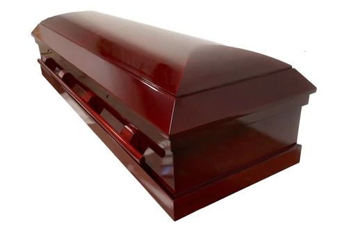 This premium coffin is defined by its towering high-roof profile and a unique double-tiered "stair" lid. Constructed from high-grade solid hardwood with a brilliant high-gloss finish, the design features elegant flared sides and hand-carved rope molding. It offers a spacious interior, gold-toned swing-bar hardware, and a luxury velvet lining, providing a grand and dignified presence